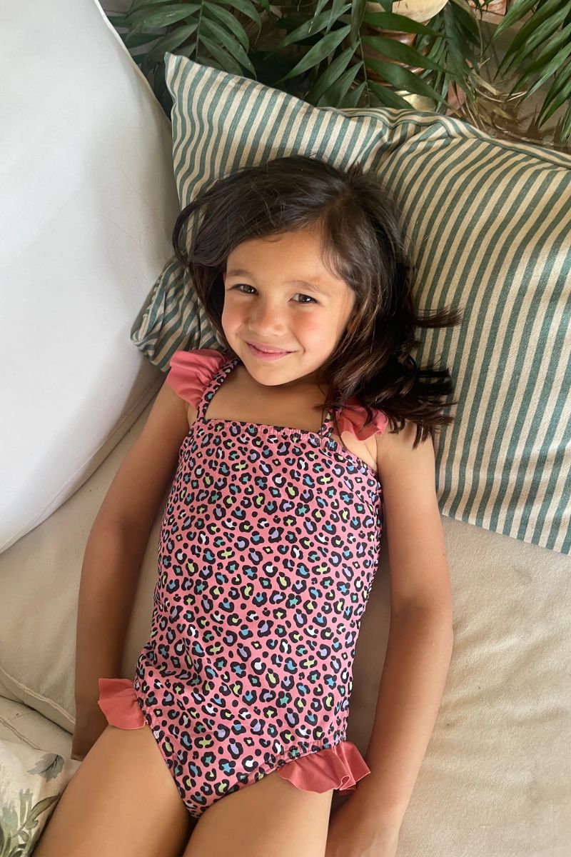 Nuestro Bañador Rosa Caprisa con estampados leopardo de color rosa con más colores se ha realizado en colaboración con la marca infantil Sophie Moda Infantil. Junto a esta marca hemos desarrollado una colaboración para que puedas ir a juego con los más peques de la casa.